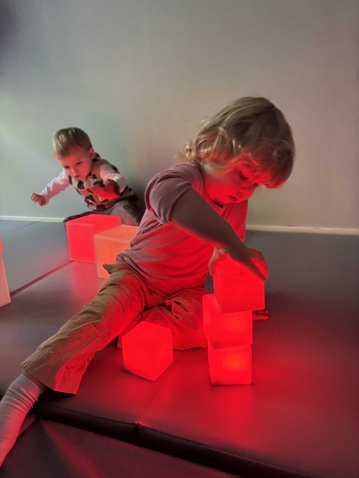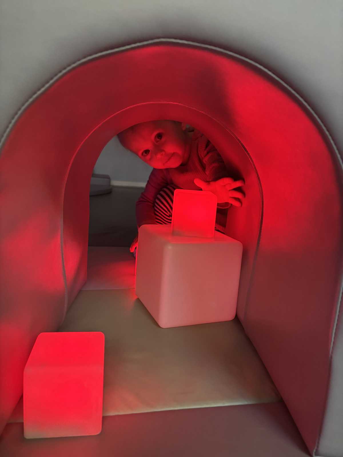 Endelig har vi et rum, vi kalder skyen. Det er vores sanserum, hvor der er plads til alt fra sansestimuli til motorisk udfoldelse.