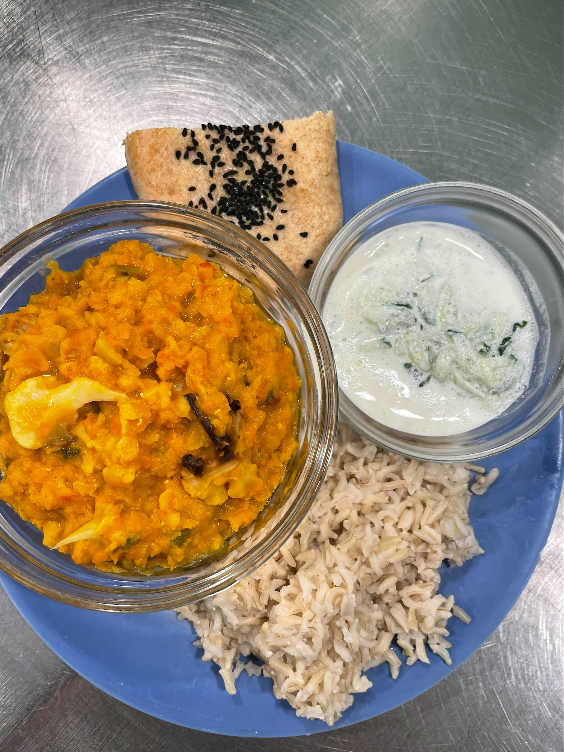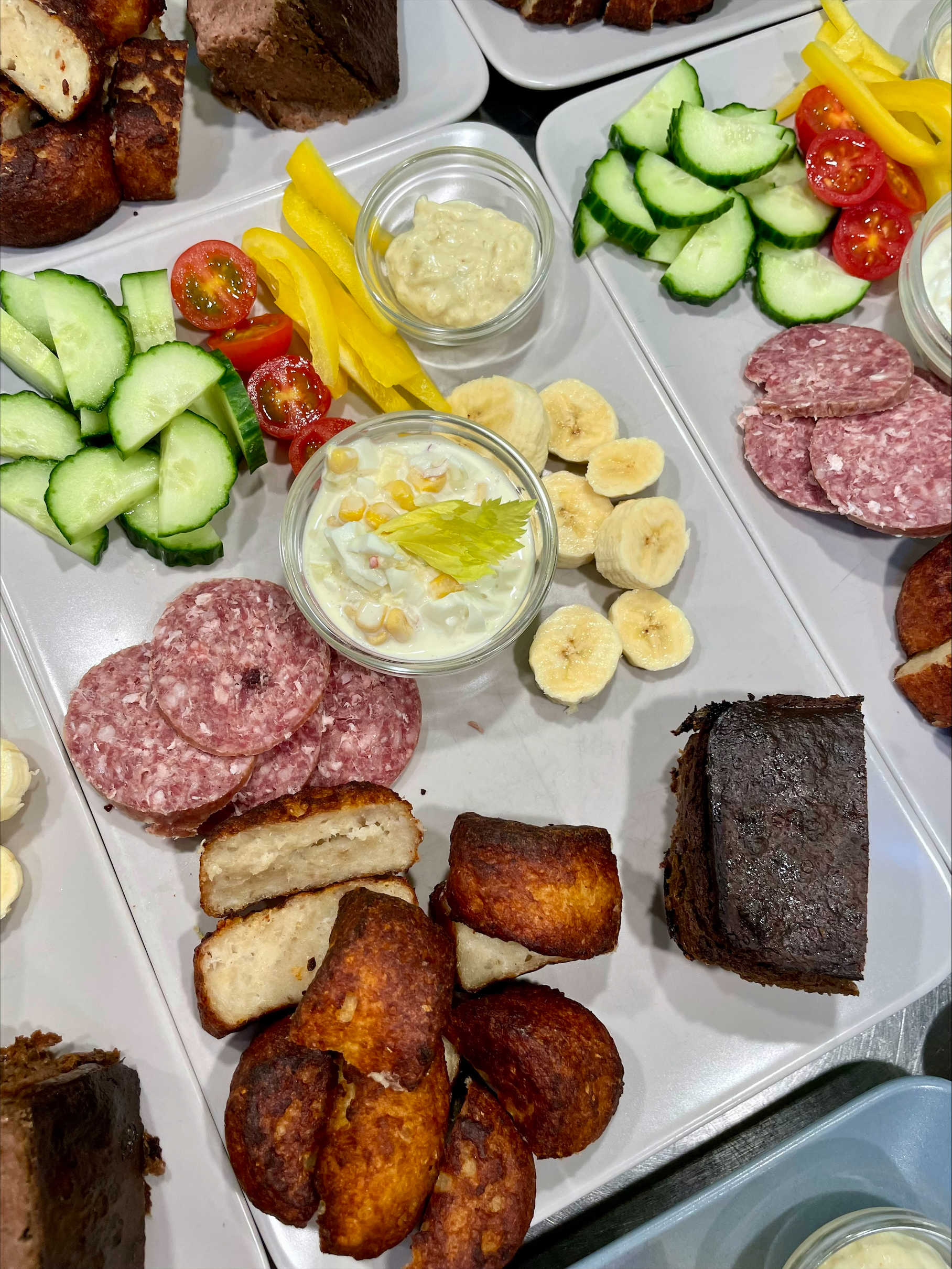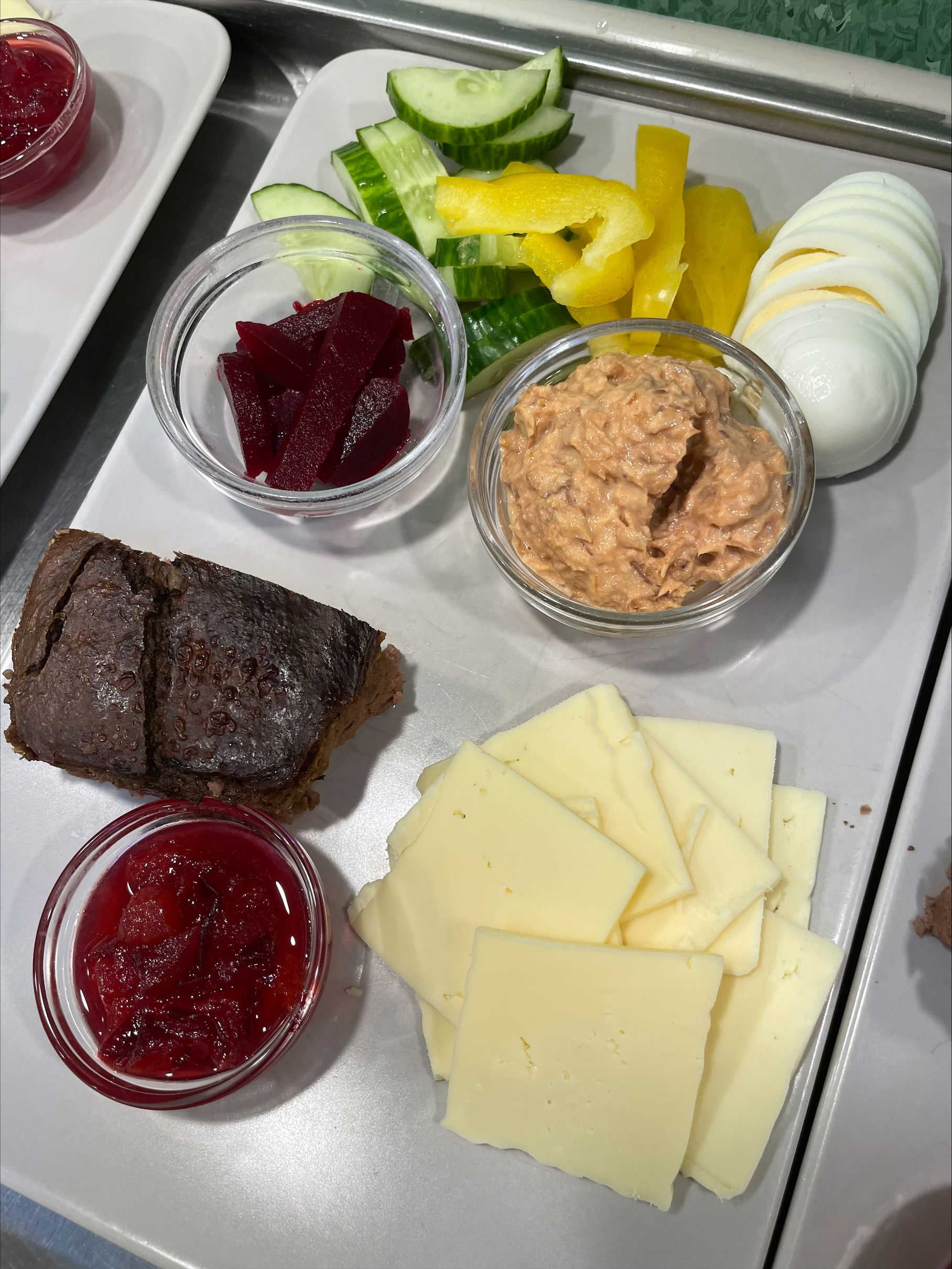 Måltiderne starter allerede, når vi kan dufte maden og kan se på køkkentavlen, hvilke råvarer der bliver brugt. Alle går på badeværelset for at vaske hænder, og så fordeler hver stue sig ved tre borde med 4-5 børn en voksen ved hvert bord.