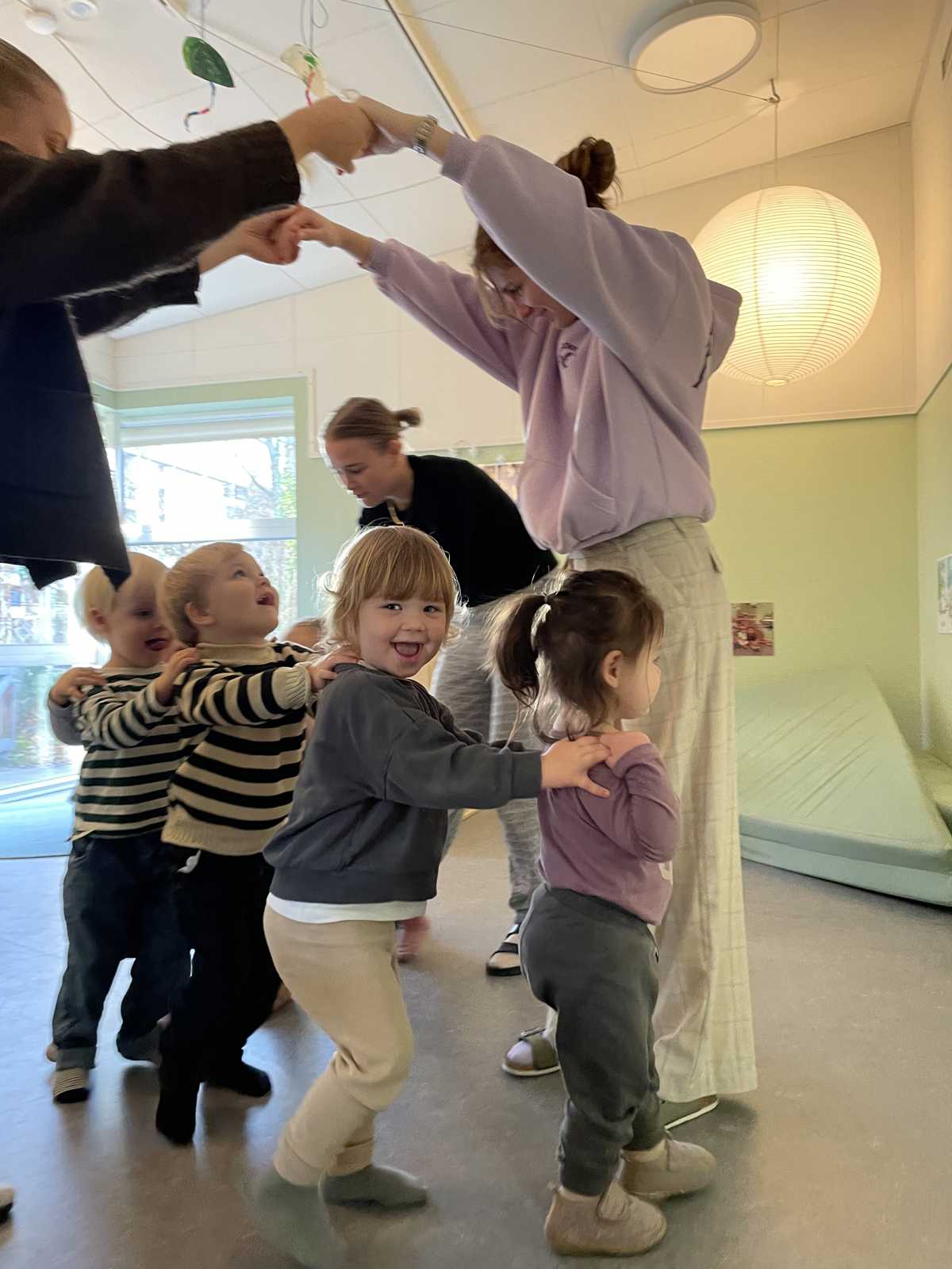 Vi synger mange sange, og børnene er med til på skift at vælge en sang. Nogle gange synger vi ved bordet. Andre gange har vi sanglege på gulvet. Det kan også være, at de voksne laver teater.